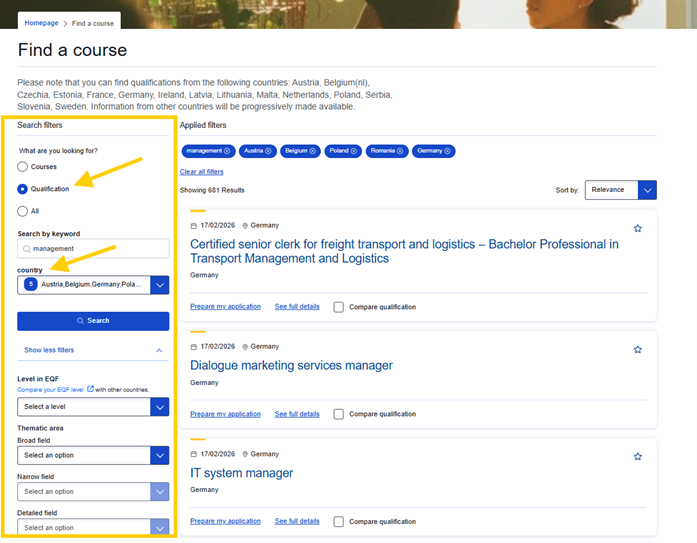 Use the filters on the left-hand side to refine the search by selecting “Qualifications”, choosing countries of interest, and/or entering keywords