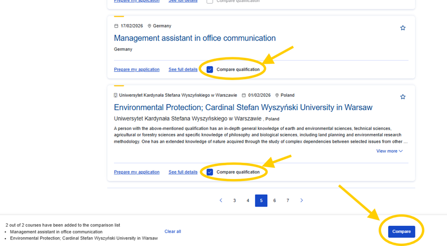Select two qualifications by ticking the “Compare qualification” checkbox displayed on each result